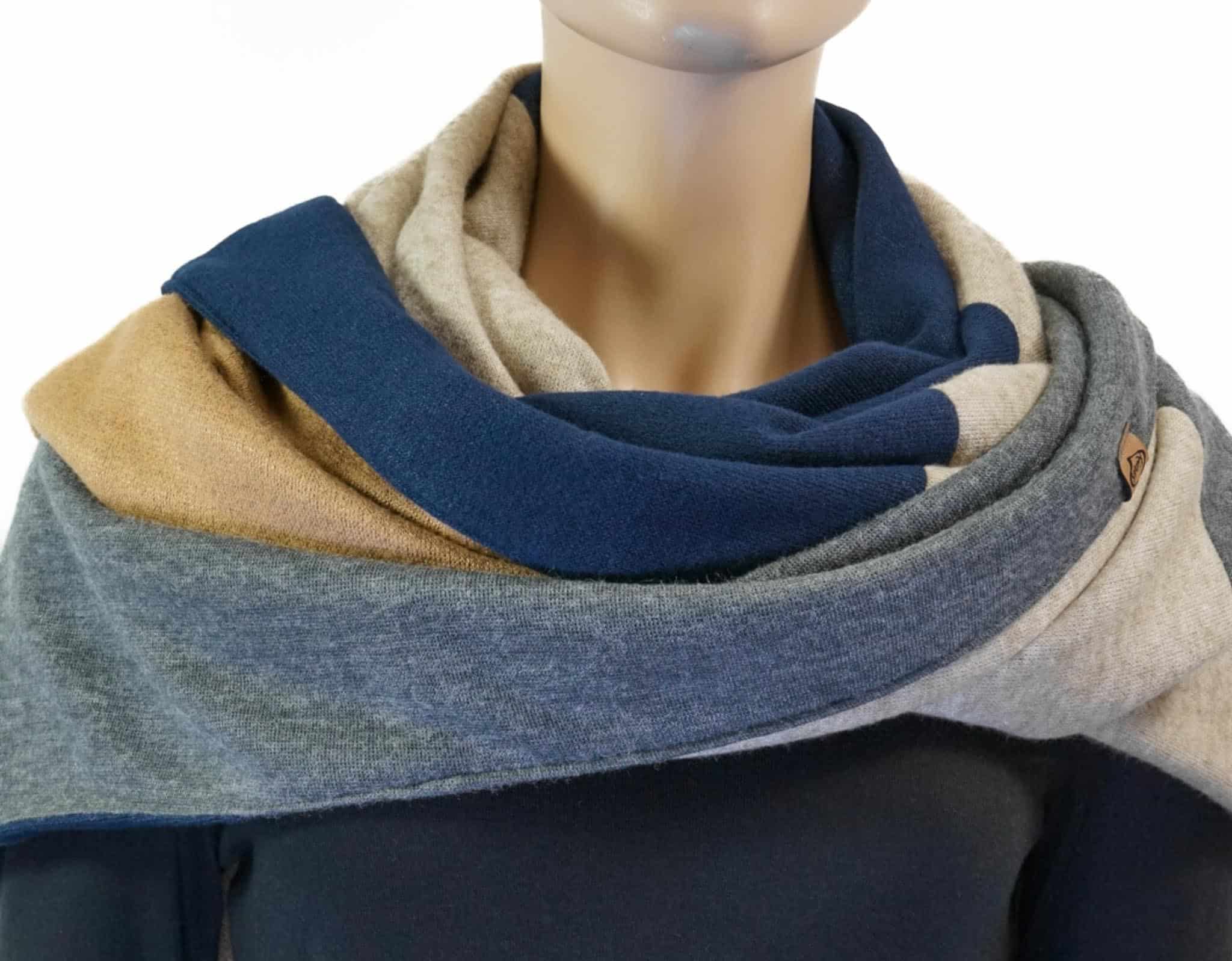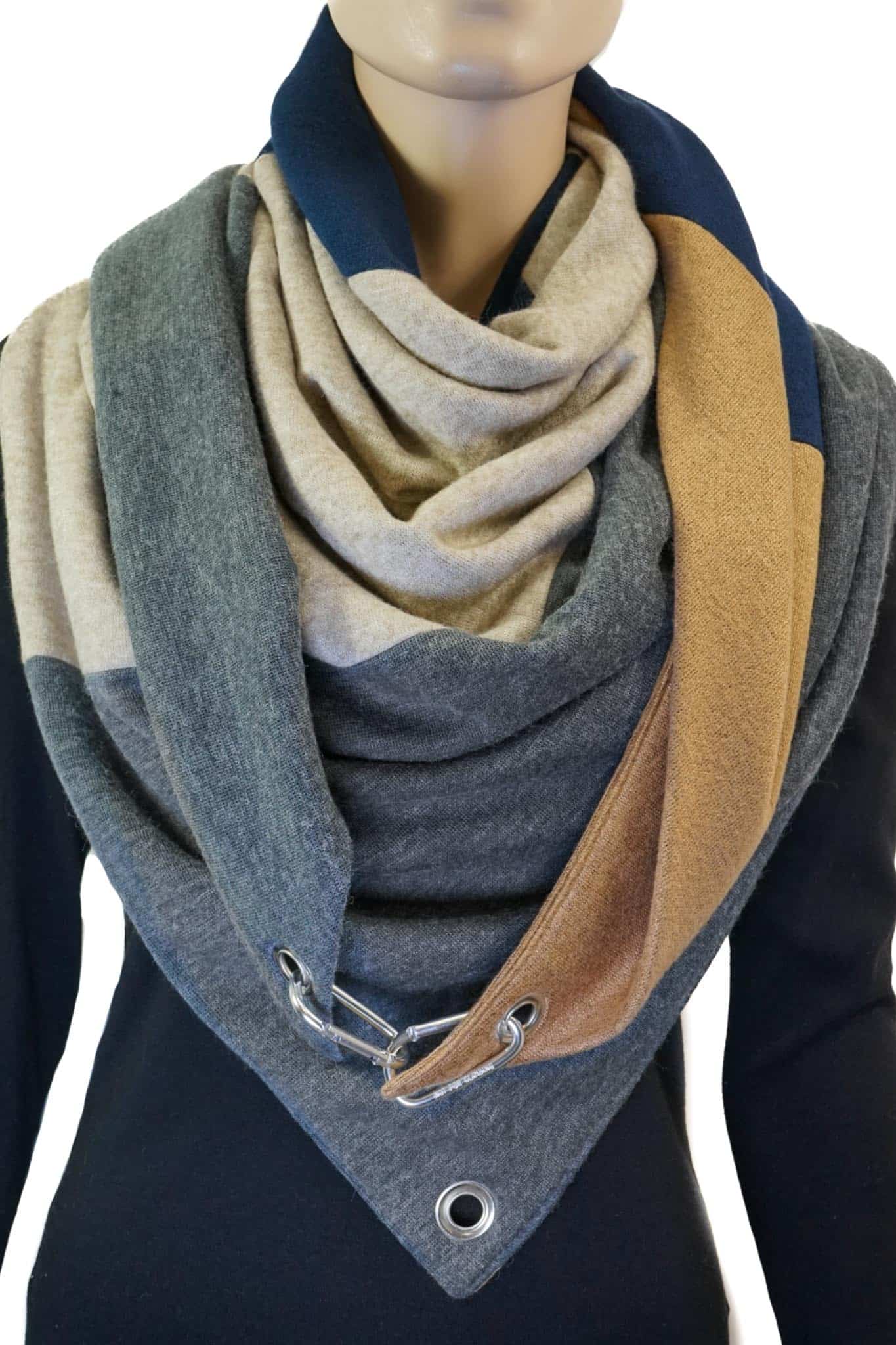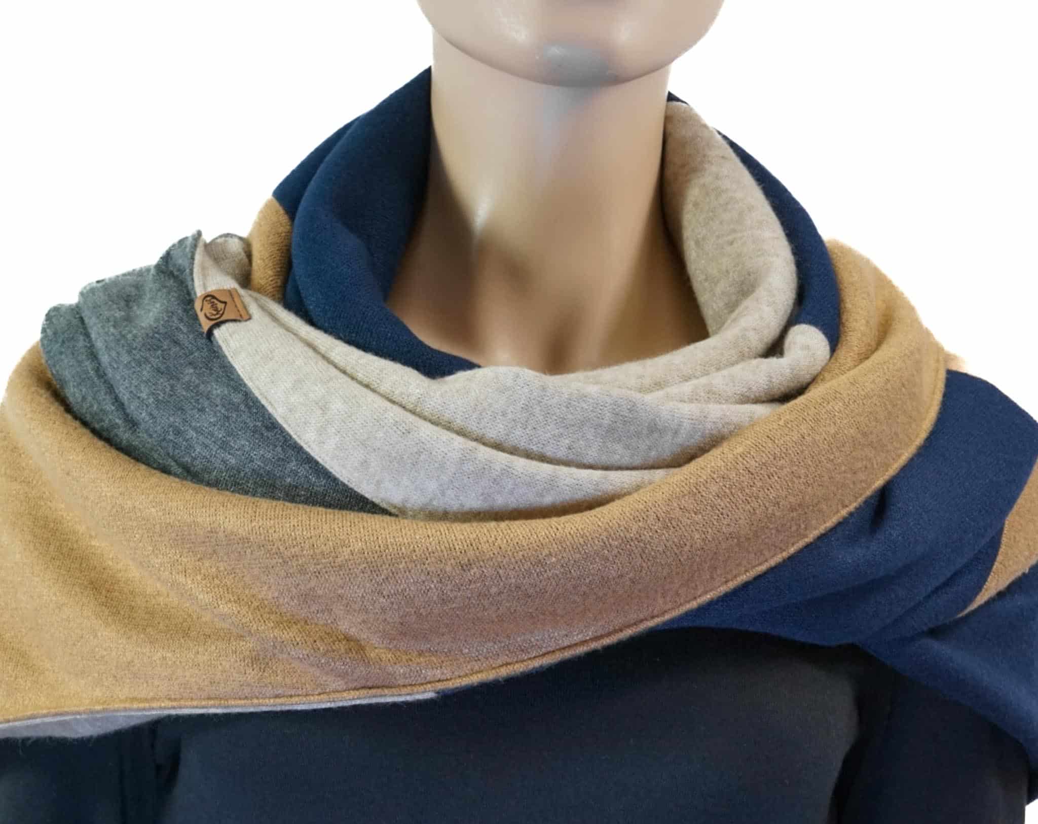 Dieses Karabinertuch vereint verschiedene Strickstoffe in warmem Camel, hellem Beige und kühlem Grau. Die weiche Haptik ohne Wolle macht es zum idealen Begleiter für empfindliche Haut.