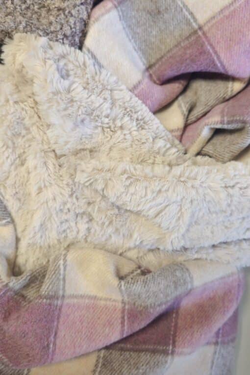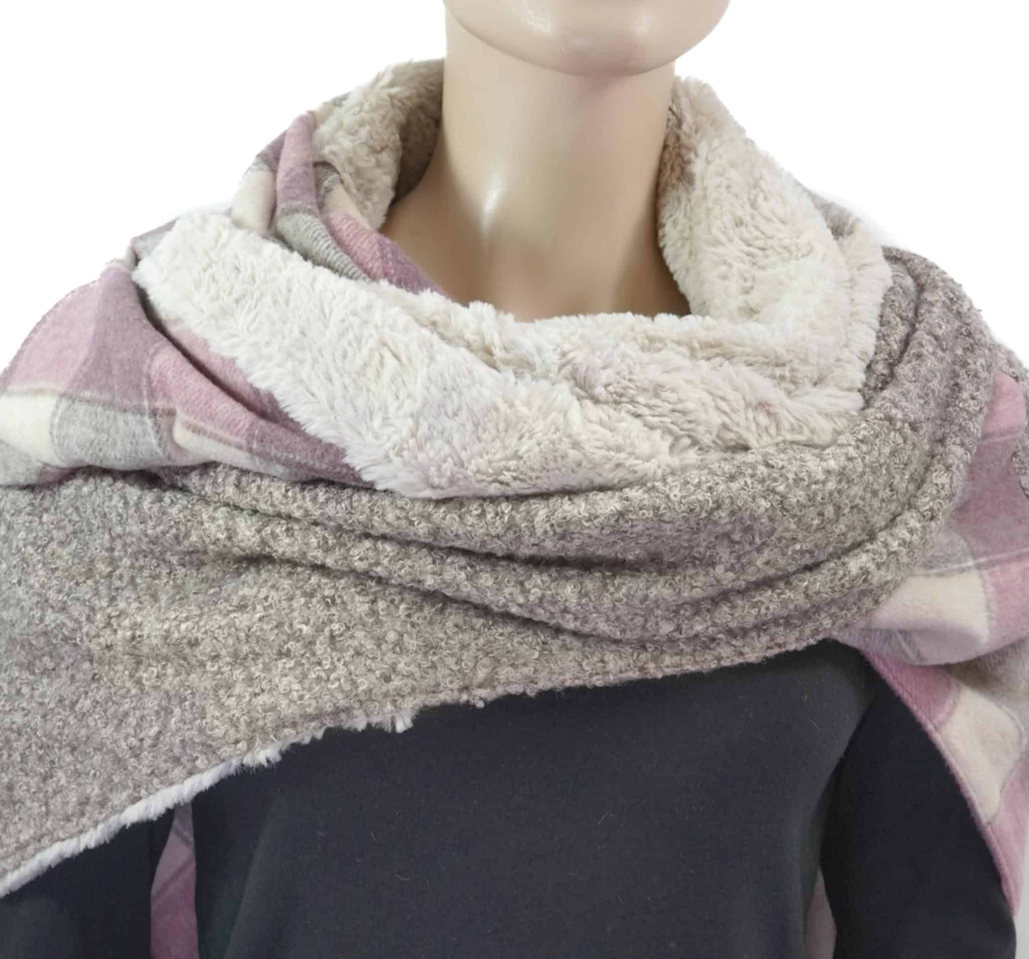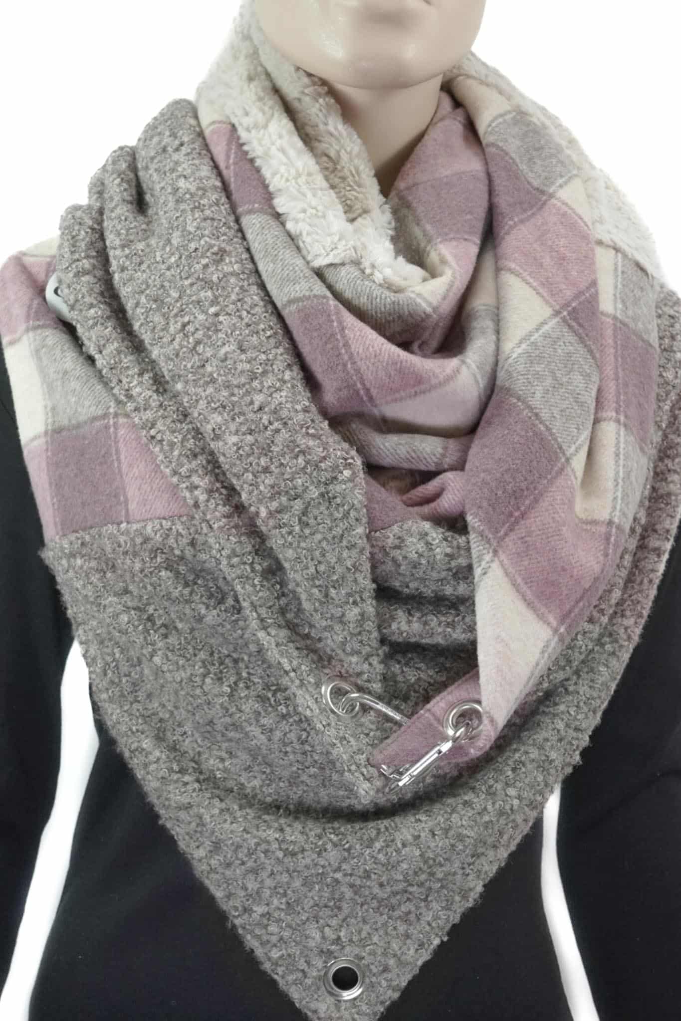 Dieses Karabinertuch vereint verschiedene Stoffstrukturen: kariert in zartem Rosa-Greige, kombiniert mit weichem Teddyfell in Creme und einer melierten Boiuclé in Taupe – ganz ohne Wolle. Je nach Seite wirkt dein Look mal sanft und elegant, mal etwas rustikaler.
